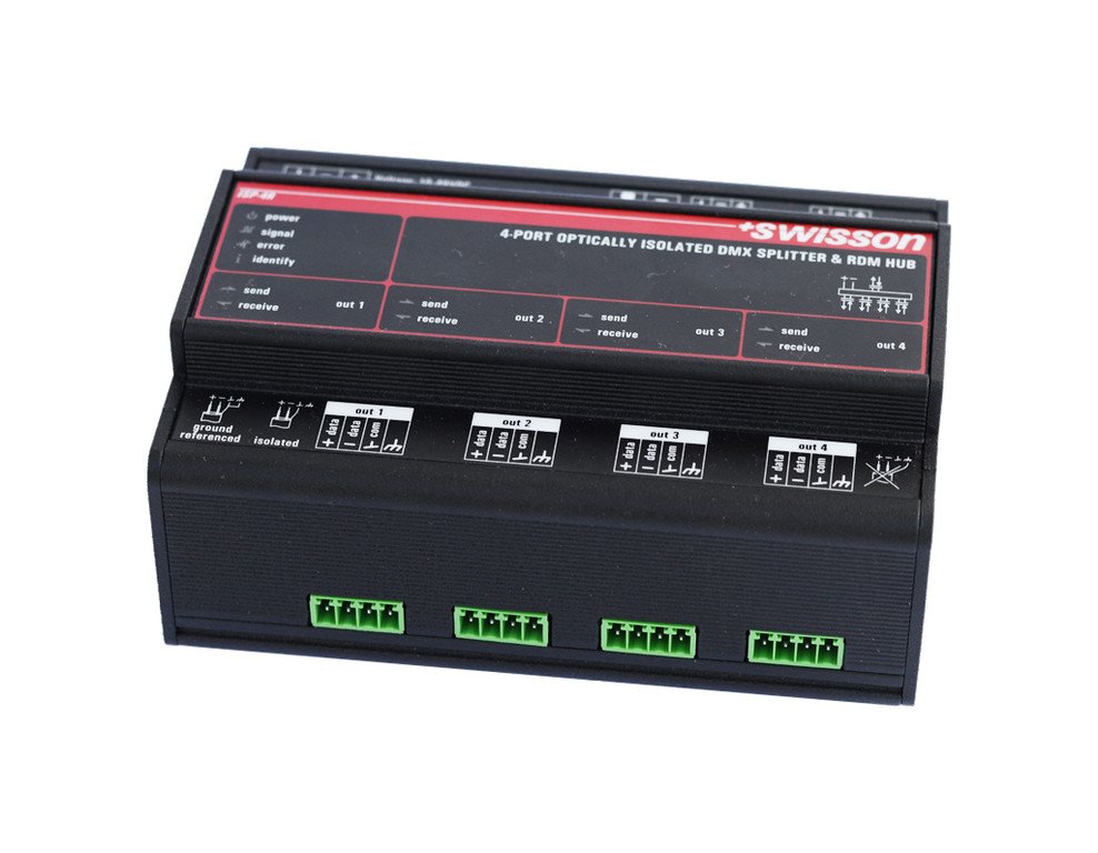 The DMX splitter boosts an incoming DMX signal and provide it on four output ports. This allows for safely going beyond the 32 devices limit of the DMX standard, as well as for building star topologies.