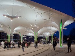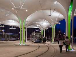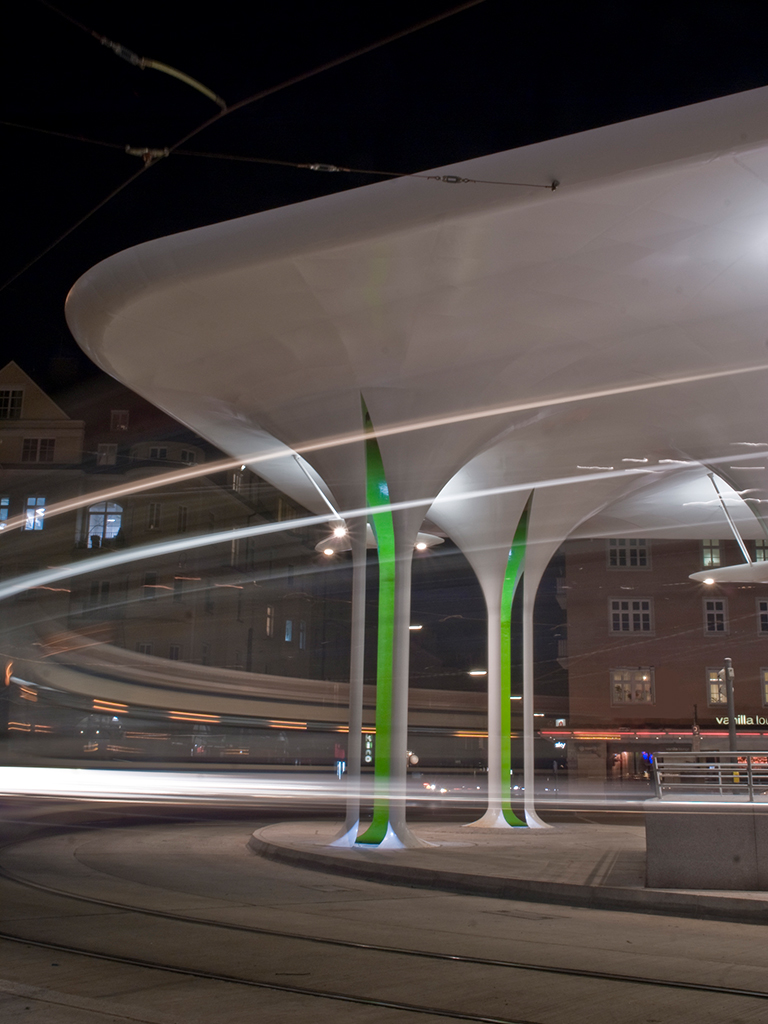 Topped by goblet-like capitals, composed of three segments each, the 18 delicate columns bear the approx. 200 tons of the tram station's roof that comprises a total of 15 kilometers of electric cables and supply lines.