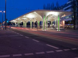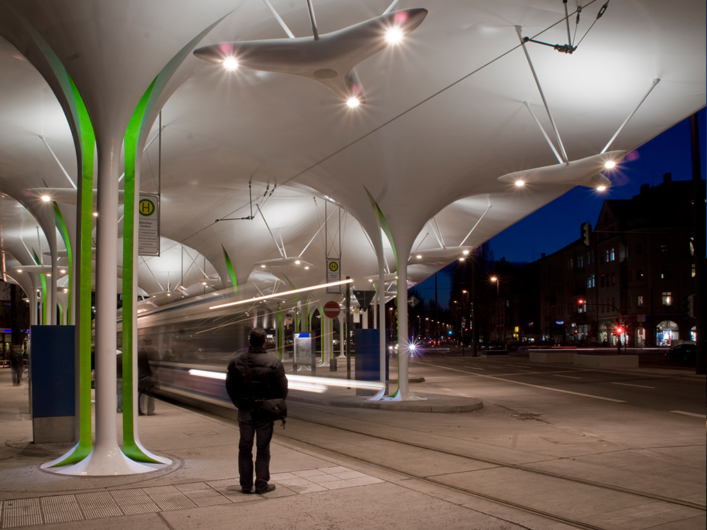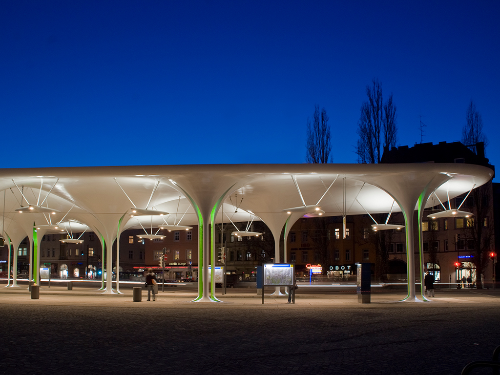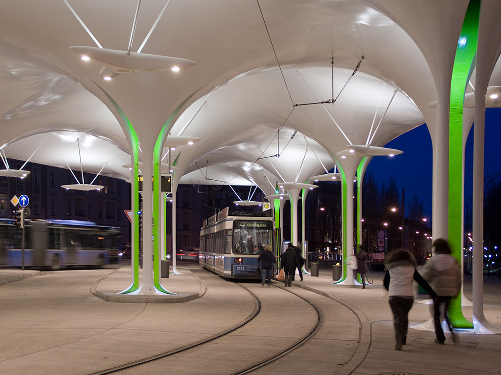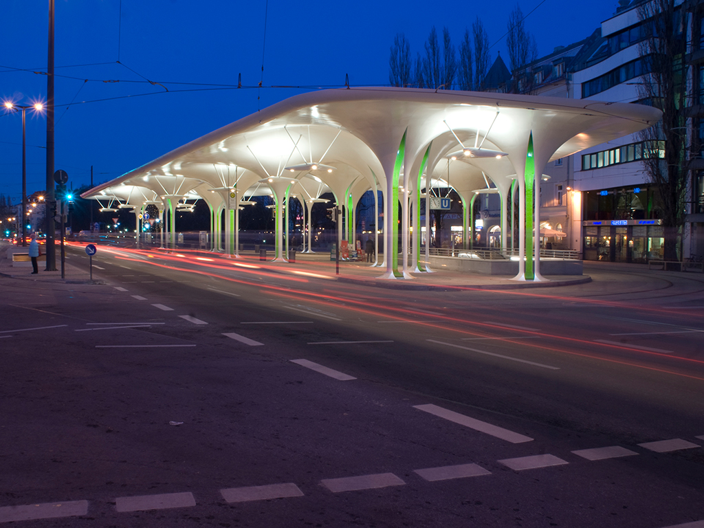 Strolling along the Leopoldstraße in Munich's Schwabing district, you will inevitably happen upon the tram station "Münchner Freiheit", a softly curved roof construction, supported by 18 slim columns.