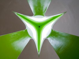 The vaulted creation is supported by white colored, goblet-shaped columns morphing into the roof and shimmering green from within, thus creating an almost floral impression of the open hall, the complete setting perfectly associated with the surrounding forestall greenery and contrasting most amicably with the architectural environment.